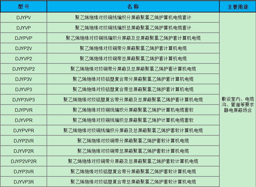 本產(chǎn)品適用于額定電壓500V及以下對(duì)于防干擾性要求較高的電子計(jì)算機(jī)和自動(dòng)化連接用電纜。